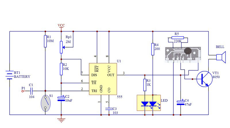 The touch vibration alarm is composed of a touch trigger circuit, a vibration trigger circuit, and an alarm circuit. The 555 timer circuit U1 forms a typical monostable working mode, and its transient time is determined by the values of RP1, R2, and C2. Normally, when the circuit is in a stable state, the 3-pin output of the 555 timer circuit is at a low level, and the alarm chip does not alarm because there is no power supply. When a human hand touches the electrode piece M, the noise signal induced by the human body is injected into the trigger terminal (pin 2) of the 555 timer via C1. Alternatively, when the vibration sensor S1 is momentarily activated due to vibration, both scenarios will cause an instantaneous low level at pin 2 of U1, causing the 555 timer circuit to flip into a transient state. Pin 3 then abruptly changes to a high level, powering the alarm chip and triggering an alarm sound. Once the transient time has passed, the timer circuit flips back to a stable state and stops the alarm. The length of the alarm time can be adjusted by changing RP1. The LED is a dual-color light-emitting diode. After being powered on, the green light is on and is used as a power indicator. When the alarm is on, the red and green lights are on, and the overall appearance is orange-yellow. The resistance value of R5 determines the playback speed of the alarm sound, generally 180K-240K. Note that before installing the chip, it should be installed on the alarm chip board first. The entire circuit can work with DC3-6V.