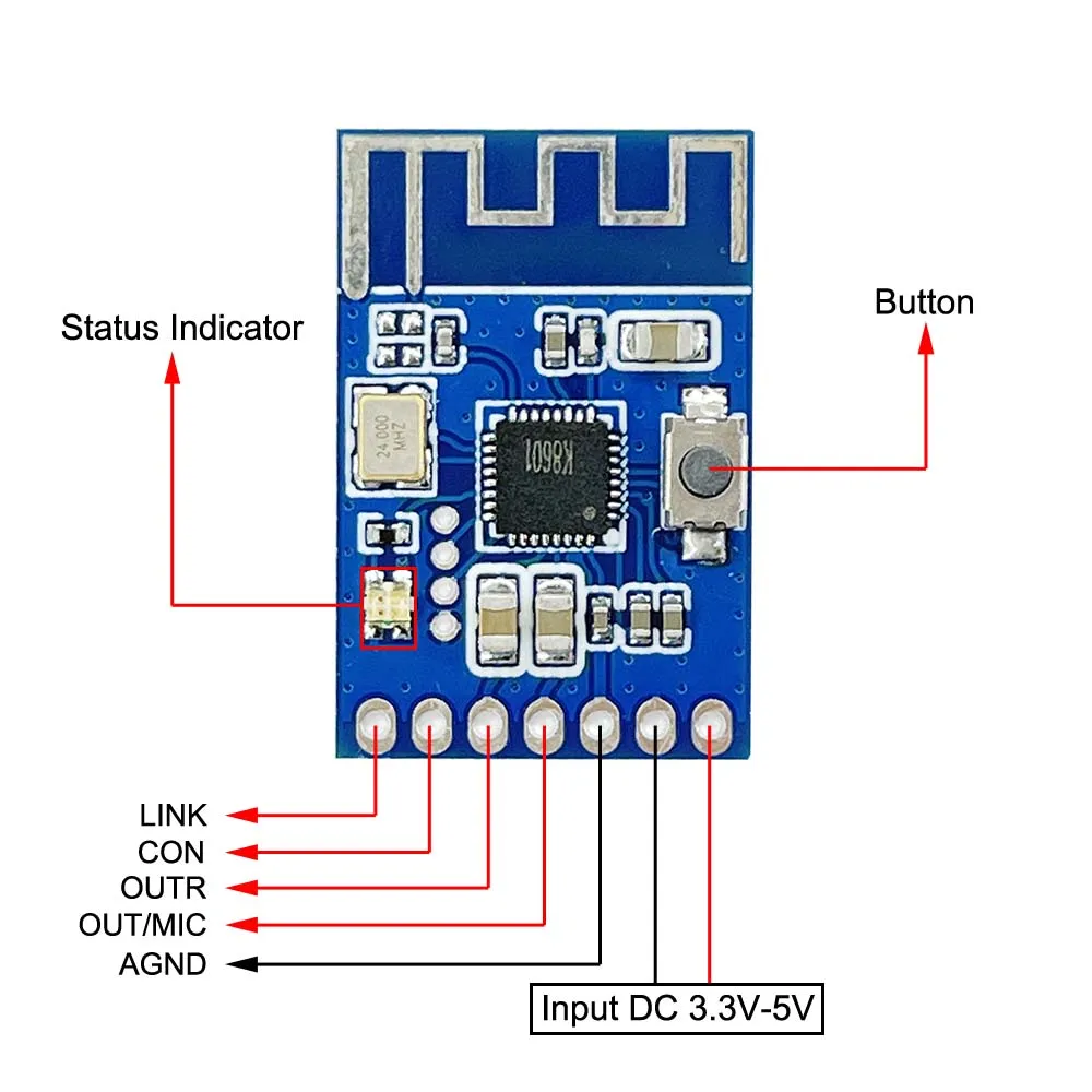 7).LINK:Paired connection status output,with connection output high level 3V,no connection output low level 0V.