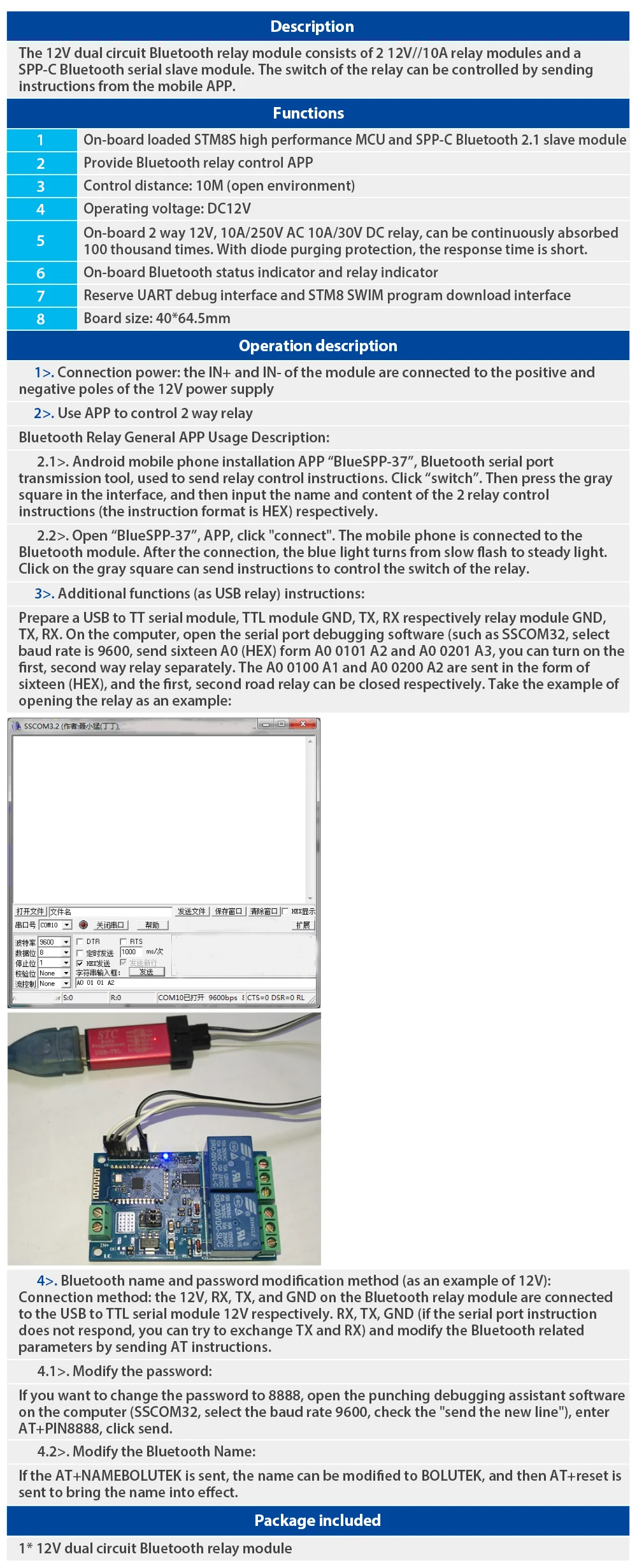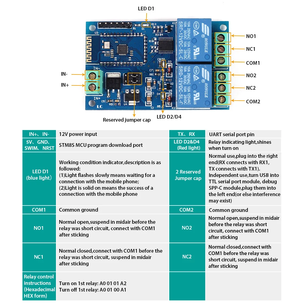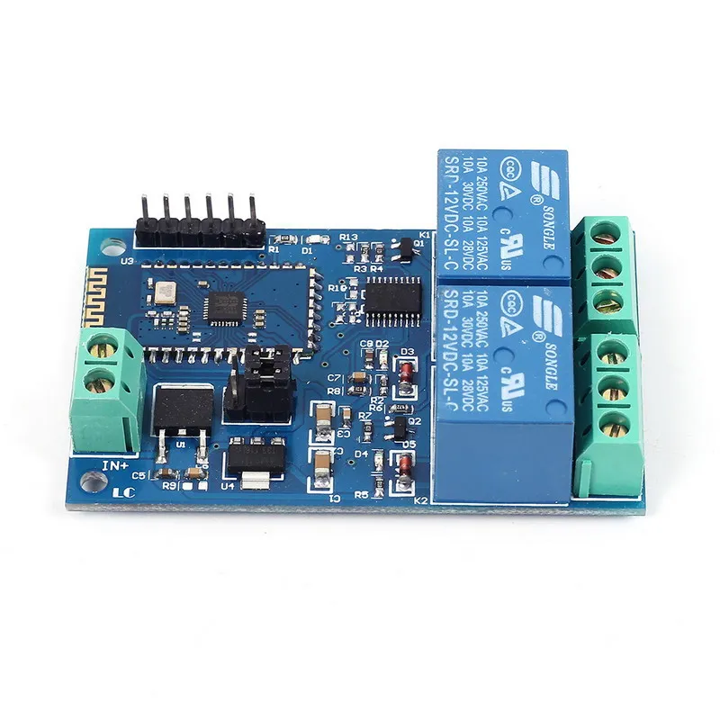 Product name is 2 Bit Bluetooth Relay Module Intelligent Home Mobile APP Remote Control Switch DC 12V Dual Circuit Bluetooth Relay Module...