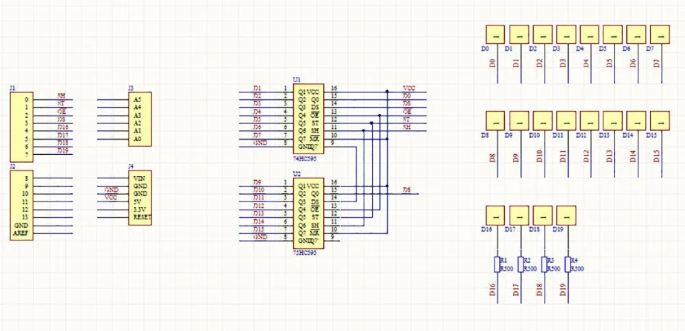 The display part of ICSTATION 4x4x4 Light Cube kit consists of 64 cuboid LED,uses two 74HC595shift register chip to control LED anode, the 4 I/O ports controls 4 common cathodes of LED.