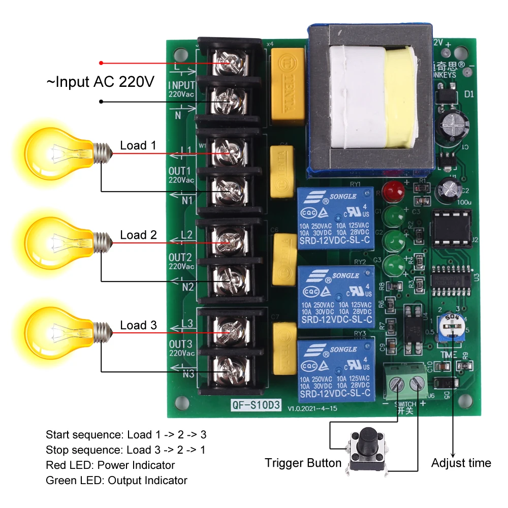 QF-S10D3 is a AC 220V 60S 3Bit Power Time Sequence Controller Module with Self-locking.The 3 output states change in turn when change input trigger signal. It can turn on and off the load in turn to protect the load and avoid the problem of excessive starting current at the same time.