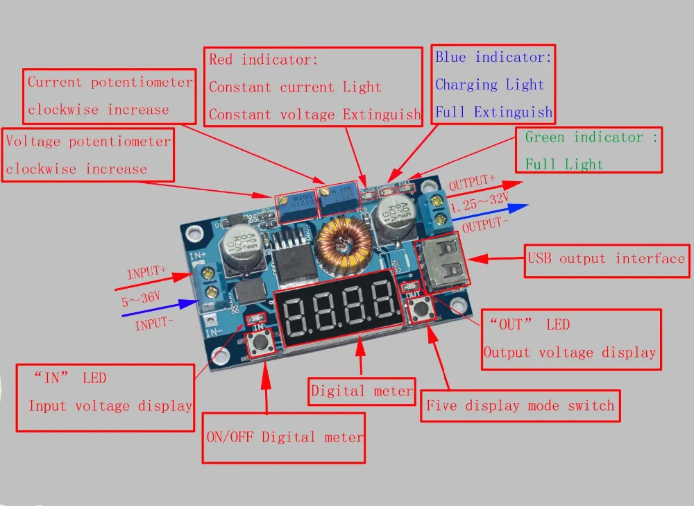 2.USB output voltage is consistent with the module, not a fixed 5V output. When charging for digital equipment, make sure USB output voltage is 5V.