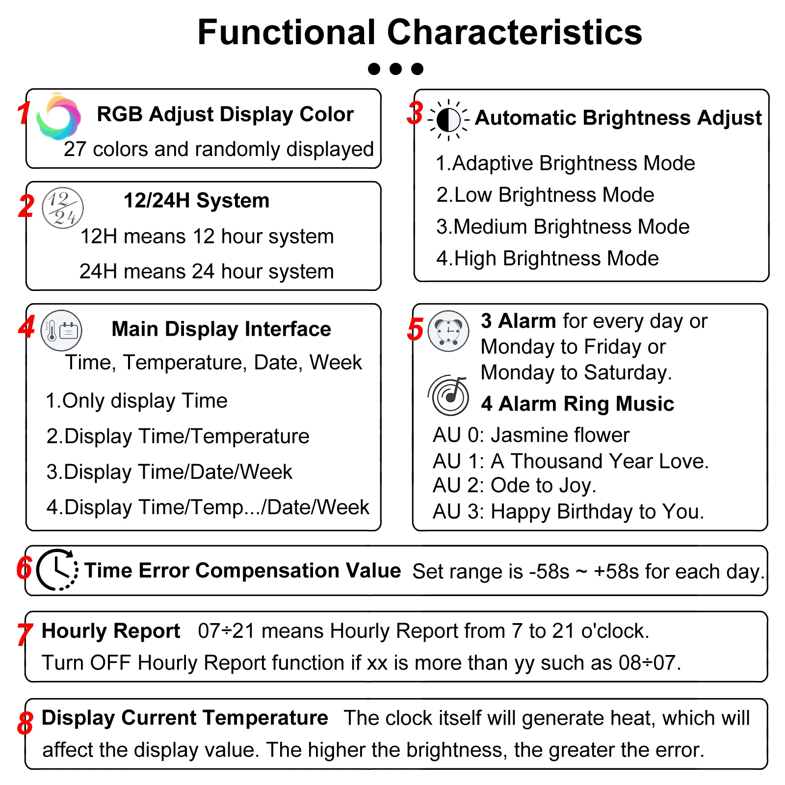 [Functions & Features]: The diy electronic clock can display Time, Date (year, month, day, week), Temperature. The brightness can be set to automatically adjust, or you can manually adjust the brightness. With power-off memory and alarm clock function, the alarm clock can be turned on or off by yourself and contains 4 music adjustable, never let you miss any important moment. The 4-digit digital electronic clock can also accurately measure temperature.