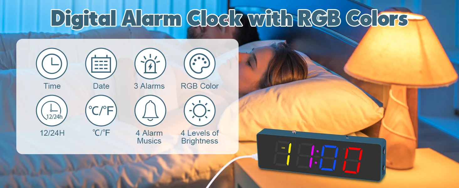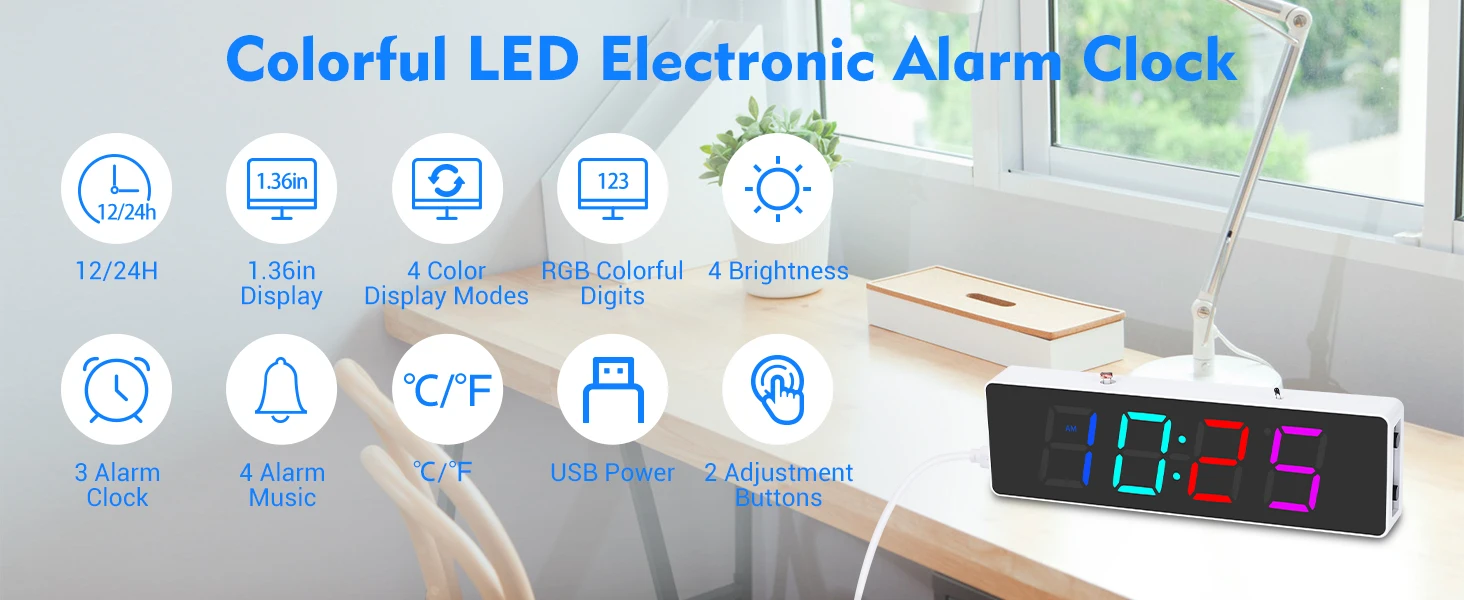 [Why Choose Clock Kit]: 12H/24H, / can be switched at will, meet your different needs. With a 1.36-inch digital tube, the screen display remains clear even from a distance. Colorful RGB LED, you can set the desired color according to your preference, or display it randomly. 3 sets of alarm Settings, support to ring every day/Monday to Friday/Monday to Saturday, you do not need to set the alarm repeatedly. 2 adjustment buttons for addition and subtraction greatly increase convenience.