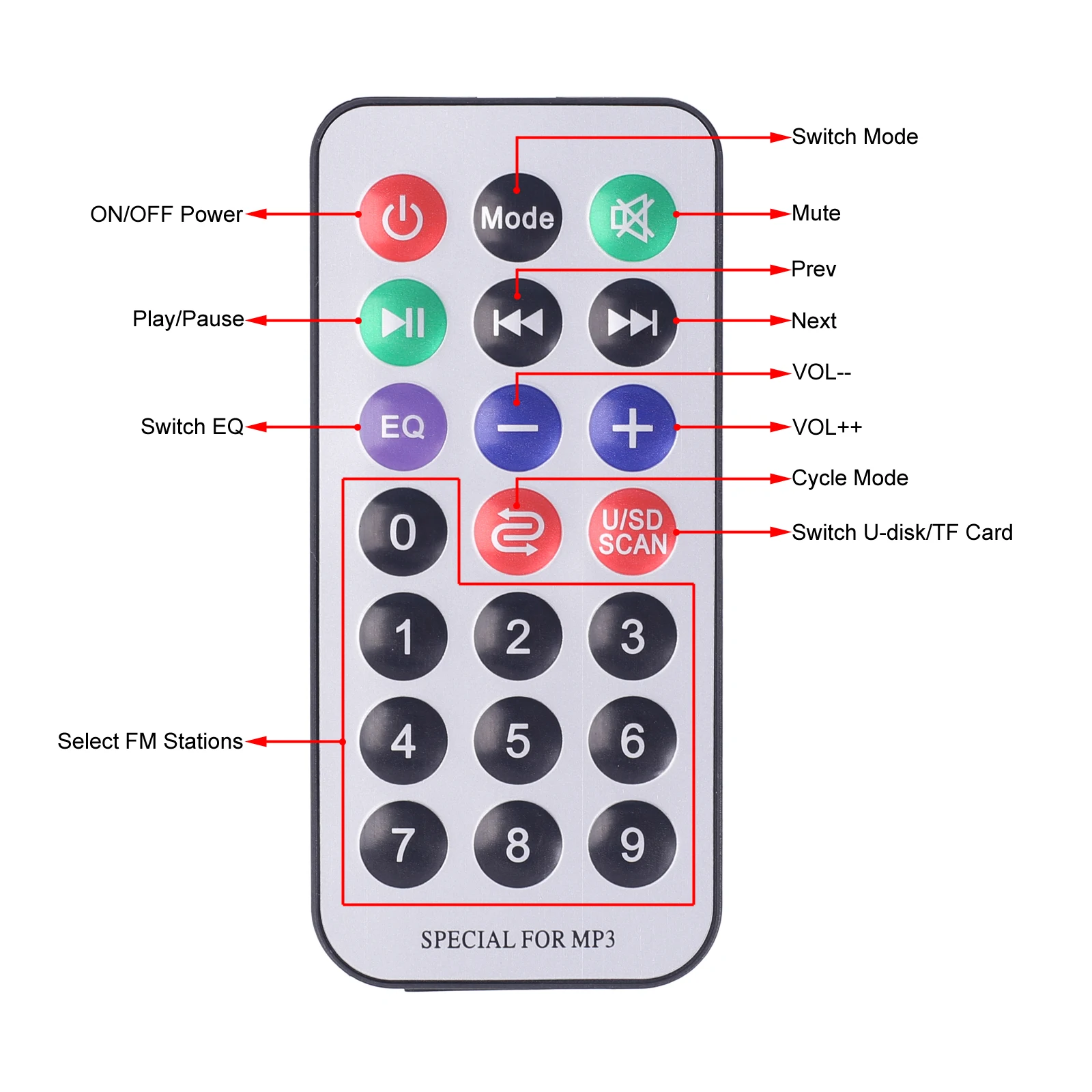 3>.SCAN Button: Short press to play or pause music. Press and hold for 3 seconds to initiate automatic radio search in FM mode.