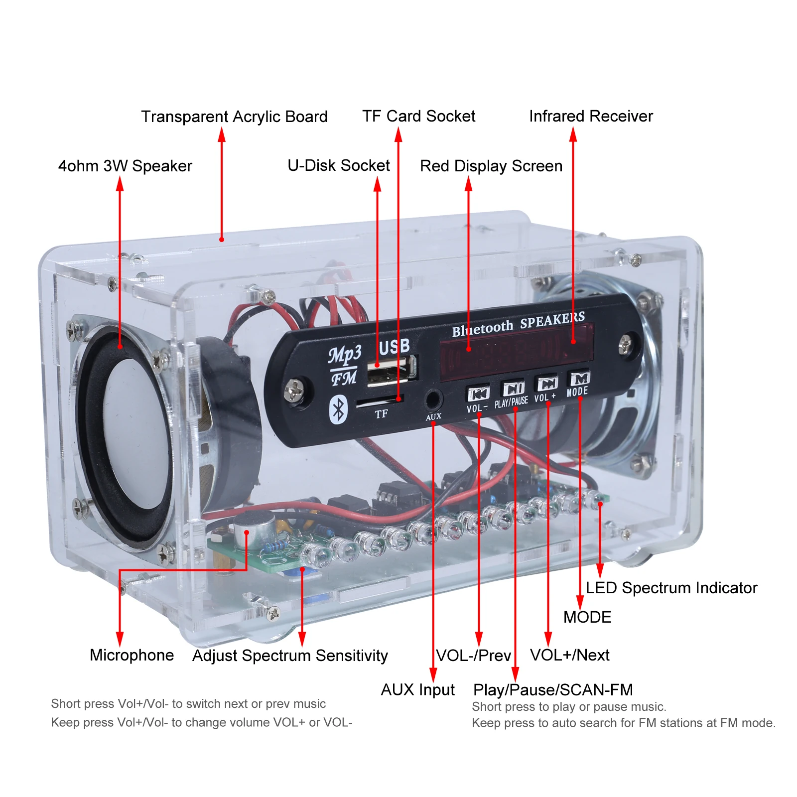 4>.Dual Channel Stereo Speaker: The device can drive two 2.0 3W*2 speakers, producing clear and powerful stereo sound.