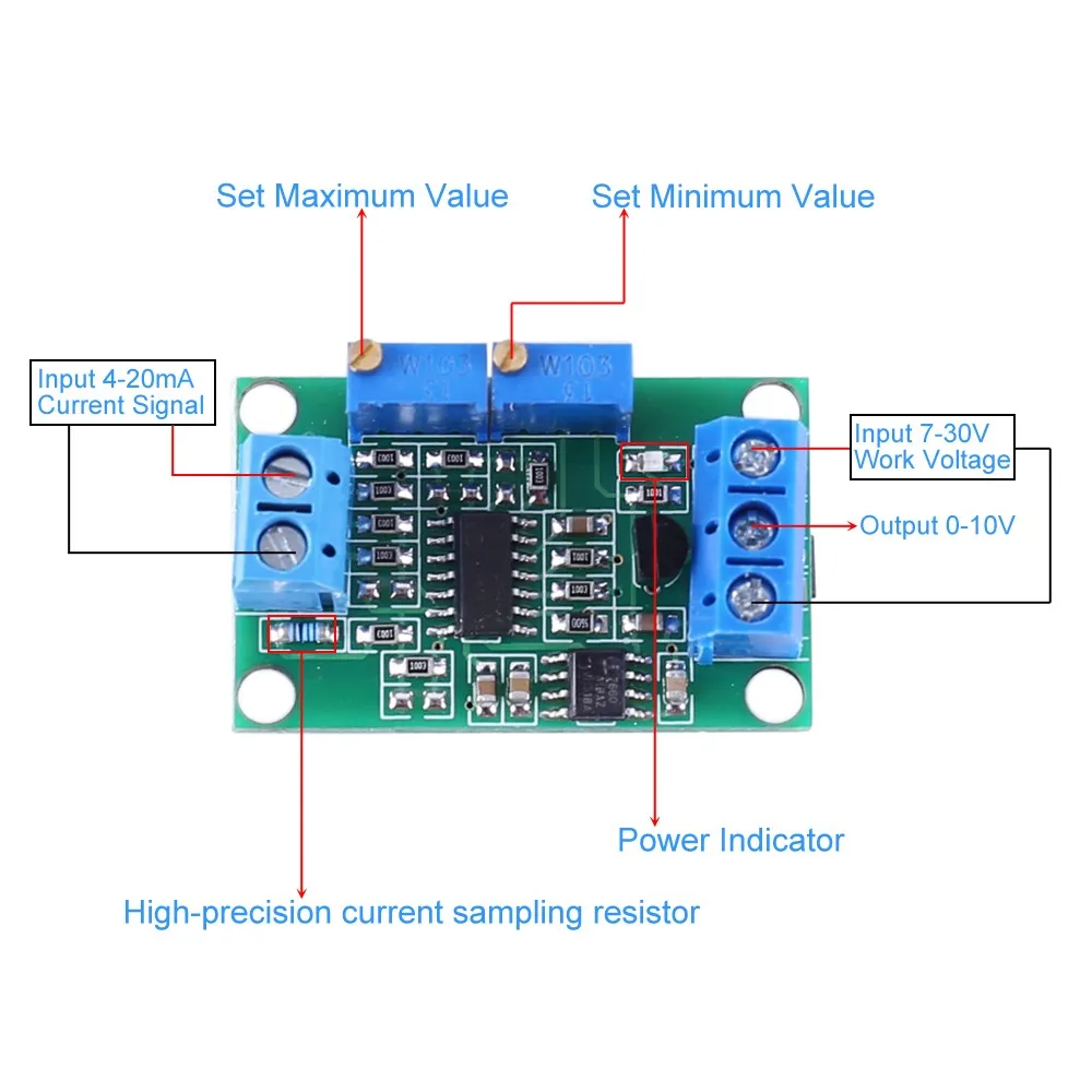 It is a 0-10V to 4-20mA Voltage to Current Converter. It can convert DC 0-10V voltage signal to 4-20mA current signal.User also can reset input voltage range and output current range by two potentiometer. It also can be used a constant current output source without input voltage signal.