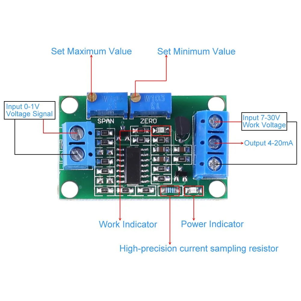 It is a 0-1V to 4-20mA Voltage to Current Converter. It can convert DC 0-1V voltage signal to 4-20mA current signal.User also can reset input voltage range and output current range by two potentiometer. It also can be used a constant current output source without input voltage signal.