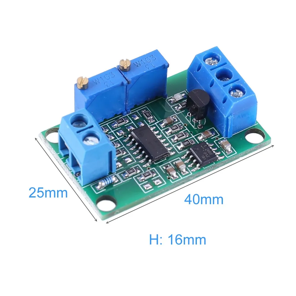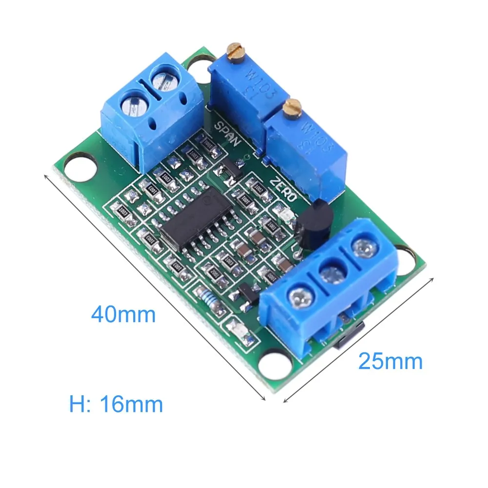 It is a 0-15V to 4-20mA Voltage to Current Converter. It can convert DC 0-15V voltage signal to 4-20mA current signal.User also can reset input voltage range and output current range by two potentiometer. It also can be used a constant current output source without input voltage signal.