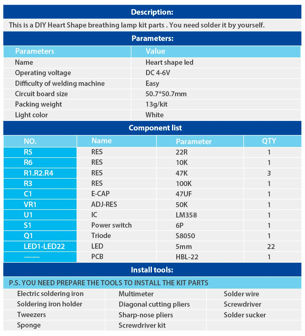 Product name is White DIY Heart Shape Breathing Lamp Kit DC4V-6V DIY Electronic Production DIY Kits Heart Shaped Lamp Suite Electronic DIY Kit...
