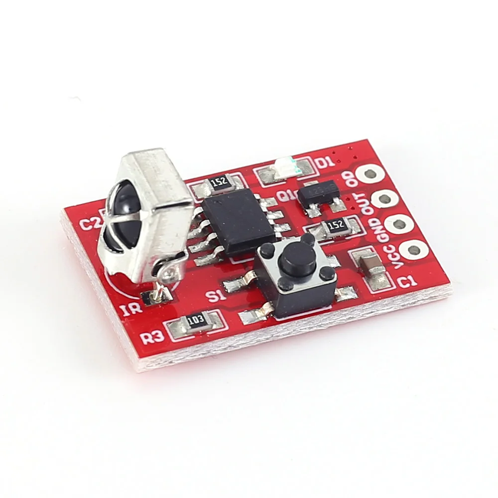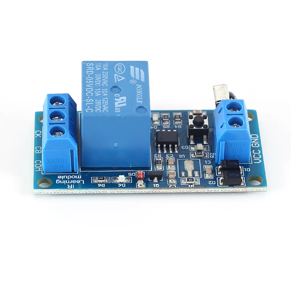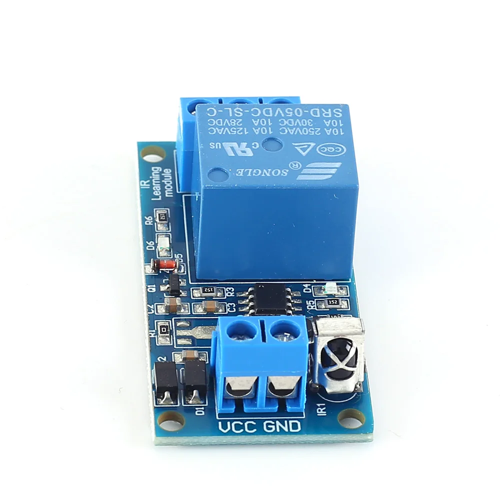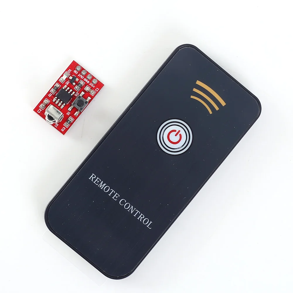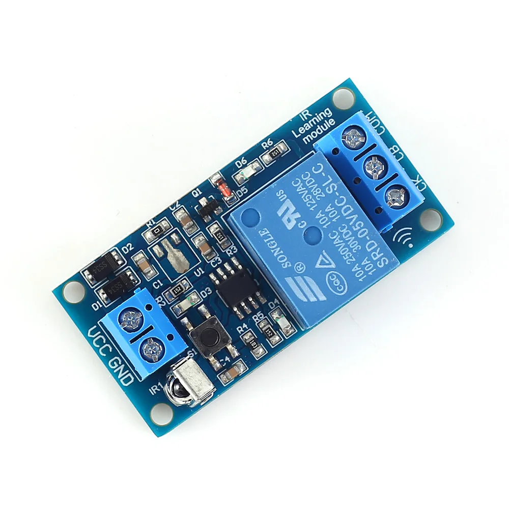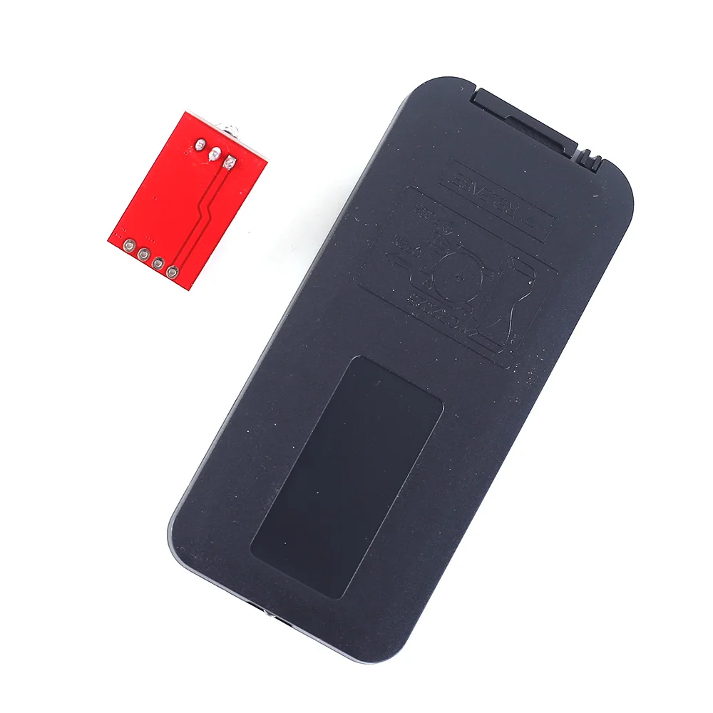 5V introduction: 1>.Working voltage: 4.5-5.5V VCC: Connected to the positive pole of the power supply GND: Connected to the negative pole of the power supply 2>.Working current: about 75mA (relay pull-in state) 3>.Static working current: about 6mA (relay release state) 4>.Module type: Infrared 1-channel learning type (can learn all NEC format infrared remote control) 5>.Receiving distance: 5-12 meters (straight line distance, the remote control is aligned with the receiving head; there is no obstacle in the middle) 6>.Working mode: self-locking, jogging, interlocking 3 working modes (module is passive output, output is only used as contact switch mechanical switch) 7>.Work instructions: D3 (power indicator), D6 (relay switch indicator), D6 (learning indicator) 8>.Module size:51*26*18mm 3-5Vintroduction: 1>.Operating voltage: 3.5-5V VCC: Connected to the positive pole of the power supply GND: Connected to the negative pole of the power supply 2>.Working current: about 5mA (relay pull-in state) 3>.Static working current: about 3mA (relay release state) 5>.Module type: Infrared 1-way learning type (can learn all NEC format infrared remote control) 6>.Receiving distance: 5-12 meters (straight line distance, the remote control is aligned with the receiving head; there is no obstacle in the middle) 7>.Working mode: self-locking, jogging, interlocking 3 working modes OUT interface---output high and low level 8>.signal: OD interface---output is driving MOS tube switching signal 9>.Work instructions: D1 (learning indicator) 10>.Module size:24*15*12mm Instructions: 1>.Self-lock mode: After power-on, press and hold the button S1 on the module, the indicator light D4 flashes 1 time, then release the button, then press the remote control button that needs to be learned; the module D4 indicator flashes 3 times and does not flash. At this time, the remote control button is successfully learned, and the module is automatically set to the self-lock mode. 2>.Jog mode: After power-on, press and hold the button S1 on the module, the indicator light D4 flashes 2 times, then release the button, then press the remote control button that needs to be learned; the module D4 indicator flashes 3 times and does not flash. At this time, the remote control button is successfully learned, and the module is automatically set to the jog mode. 3>.Interlock mode: After power-on, press and hold the button S1 on the module, the indicator light D4 flashes 3 times, then release the button, then press the remote control button that needs to be learned; the module D4 indicator flashes 3 times and does not flash. At this time, the remote control button is successfully learned, and the module is set to be able to be turned on or off. After power-on, press and hold the button S1 on the module, the indicator light D4 flashes 4 times, then release the button, and then press and hold the remote controller that needs to be learned. Button; module D4 indicator flashes 3 times and does not flash; at this time, the remote control button is successfully learned, and the module is set to only turn off and can not be turned on; thus achieving the function of one button to open a button. 4>.Clear operation instructions: After power-on, press and hold the button S1 on the module, the indicator light D4 flashes 5 times, then release the button; the module is cleared. ![]() ![]() ![]() ![]() ![]() ![]() ![]() ![]() ![]() ![]() ![]() |
