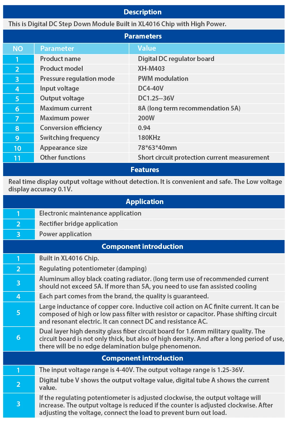 Product name is XH-M403 DC-DC Digital Voltage Regulator Buck Step Down Power Supply Module 5-36V to 1.3-32V Over Temperature Protection...